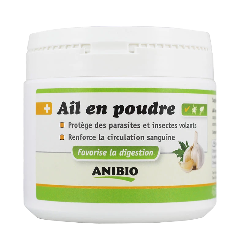 L’ail en poudre peut également être utilisé comme un antiparasitaire, il protège des parasites externes et internes et des insectes volants. Il présente également des vertus pour favoriser la digestion de votre compagnon.