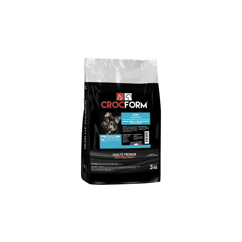 Ces croquettes d’origine française sont proposĂ©es par la marque CROCFORM dans sa gamme Premium comme un aliment complet pour chiens adultes actifs de toutes races. Hautement digestible et croquante, la nourriture ACTIF au bon goĂ»t de canard et de porc conviendra parfaitement comme alimentation quotidienne pour votre compagnon canin.