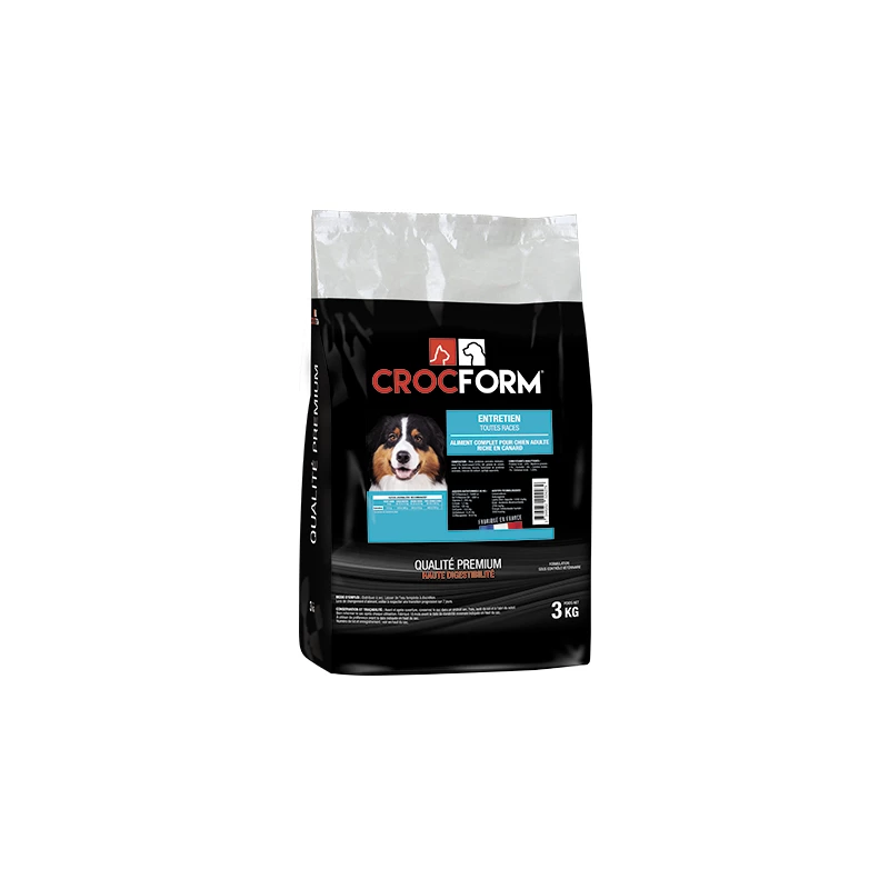 Ces croquettes d’origine française sont proposĂ©es par la marque CROCFORM dans sa gamme Premium comme un aliment complet pour chiens adultes de toutes races. Hautement digestible et croquante, la nourriture ENTRETIEN au bon goĂ»t de volaille et de porc conviendra parfaitement comme alimentation quotidienne pour votre compagnon canin.