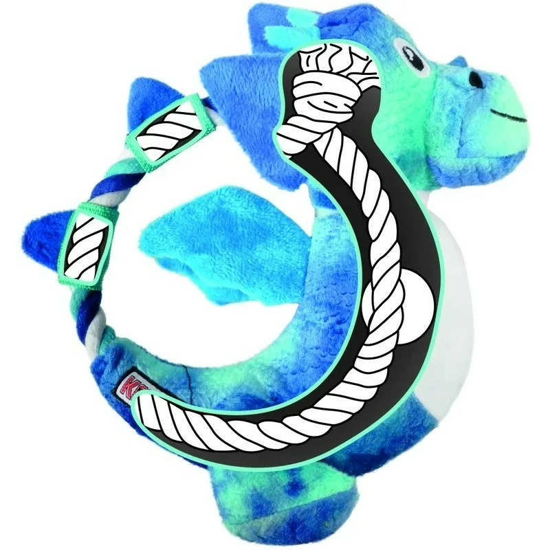 Jouet peluche pour chien en forme de dragon avec corde à nœuds à l’intérieur.