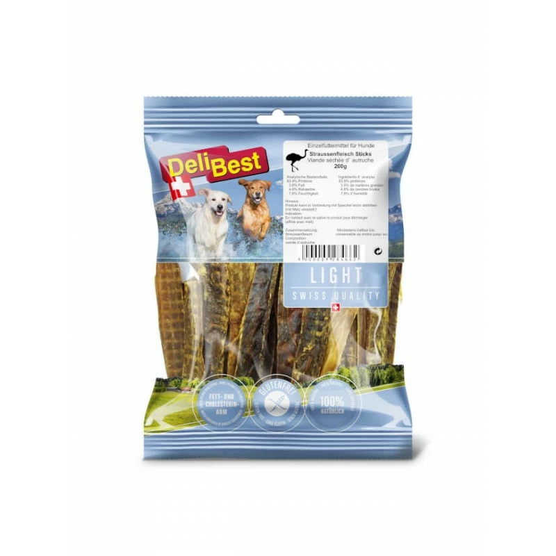 La gamme Light a été produite à partir d’un procédé de séchage qui assure la conservation des oligo-éléments pendant la réduction thermique. Les sticks de viande séchée d‘autruche conviennent aux chiens prédisposés aux allergies alimentaires. Les produits à base de viande d‘autruche se distinguent par une faible teneur en gras, un taux bas de cholestérol et une contenance riche en protéines. Ces friandises à l‘autruche sont bien tolérées et faciles à digérer.