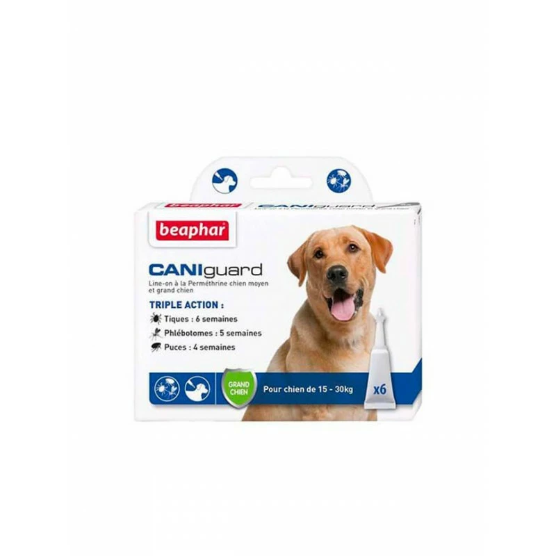 Les pipettes antiparasitaires de la gamme CANIguard offrent une triple protection contre les tiques, les puces et les phlébotomes. Conçues pour des chiens de 15 à 30 kg, elles sont à la fois curative (tuent les parasites) et préventive (protègent des nouvelles infestations). L’efficacité insecticide contre les nouvelles infestations par les puces persiste pendant 4 semaines (les nouvelles puces sont éliminées dans les 48 heures suivant l’infestation). L’efficacité acaricide contre les nouvelles infestations de tiques (Rhipicephalus sanguineus) persiste pendant 6 semaines. Les tiques présentes au moment de l’application du produit seront éliminées durant la première semaine. Ce produit permet également une activité répulsive (anti-gorgement) pendant 5 semaines et une activité insecticide rémanente pendant 3 semaines contre les phlébotomes (Phlebotomus perniciosus). Veiller à lire attentivement la notice d’utilisation avant usage.